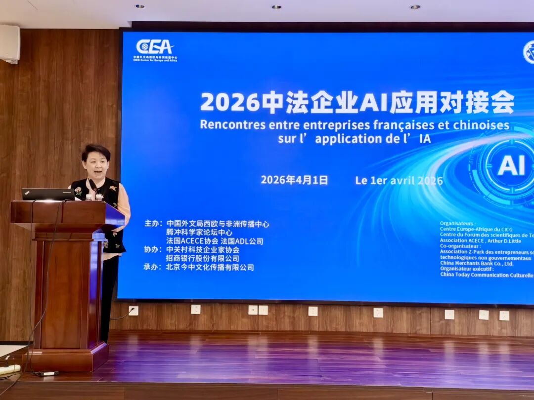 4月1日下午,由中国外文局西欧与非洲传播中心、腾冲科学家论坛中心、法国ACECE协会共同主办的2026中法企业AI应用对接会在中国外文局欧非中心举行。欧非中心副主任李五洲、腾冲科学家论坛中心副主任顾炜、法国ACECE协会李天伦、北京邮电大学人工智能学院副院长张曼,涵盖能源、投资、农业、化工、食品研发及管理咨询等行业的法国企业团一行8人及面壁智能、清湛智慧、玄创机器人、颖诺凯胜、小雨农智、神笔生物等10余家中方人工智能相关企业负责人出席了会议。