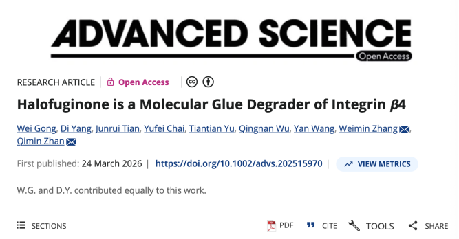 2026年3月24日,北京大学-云南白药国际医学研究中心主任詹启敏院士团队在国际权威期刊 《Advanced Science》上在线发表研究论文“Halofuginone is a Molecular Glue Degrader of Integrin β4”。该研究揭示了天然产物Halofuginone(常山酮)作为一种全新的分子胶药物,能够高效降解与多种实体肿瘤恶性进展密切相关的跨膜蛋白整合素β4,为食管鳞状细胞癌(ESCC)等多种高表达整合素β4的肿瘤带来了全新的潜在治疗方案。研究已证实,通过化学修饰优化后的PEG化常山酮保留了抗肿瘤活性,同时显著降低了系统毒性。
