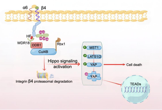 该研究首次阐明常山酮作为一种分子胶发挥作用,能将整合素β4招募至一种名为CRL4BWDR18的E3泛素连接酶复合体,从而通过泛素-蛋白酶体途径对其进行靶向降解。研究首次揭示了WDR18作为CRL4B复合物的一个新底物受体在分子胶降解过程中的关键作用。
